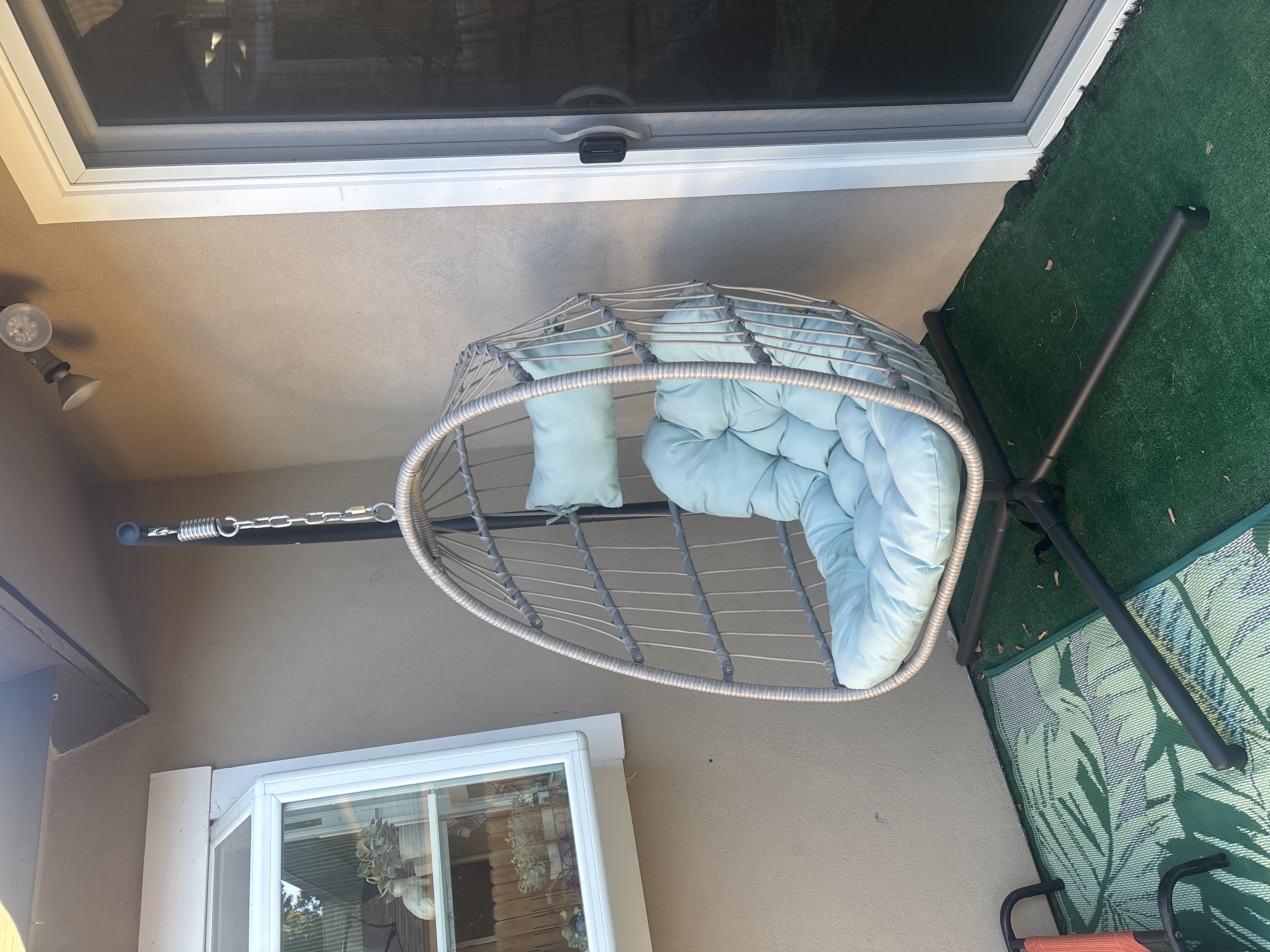 EGG SWING, very sturdy swings rotates. Very relaxing. Blue grey with head rest and cushion egg style swing chair, great for inside home or outside. We ran out of room. Red decorating.
