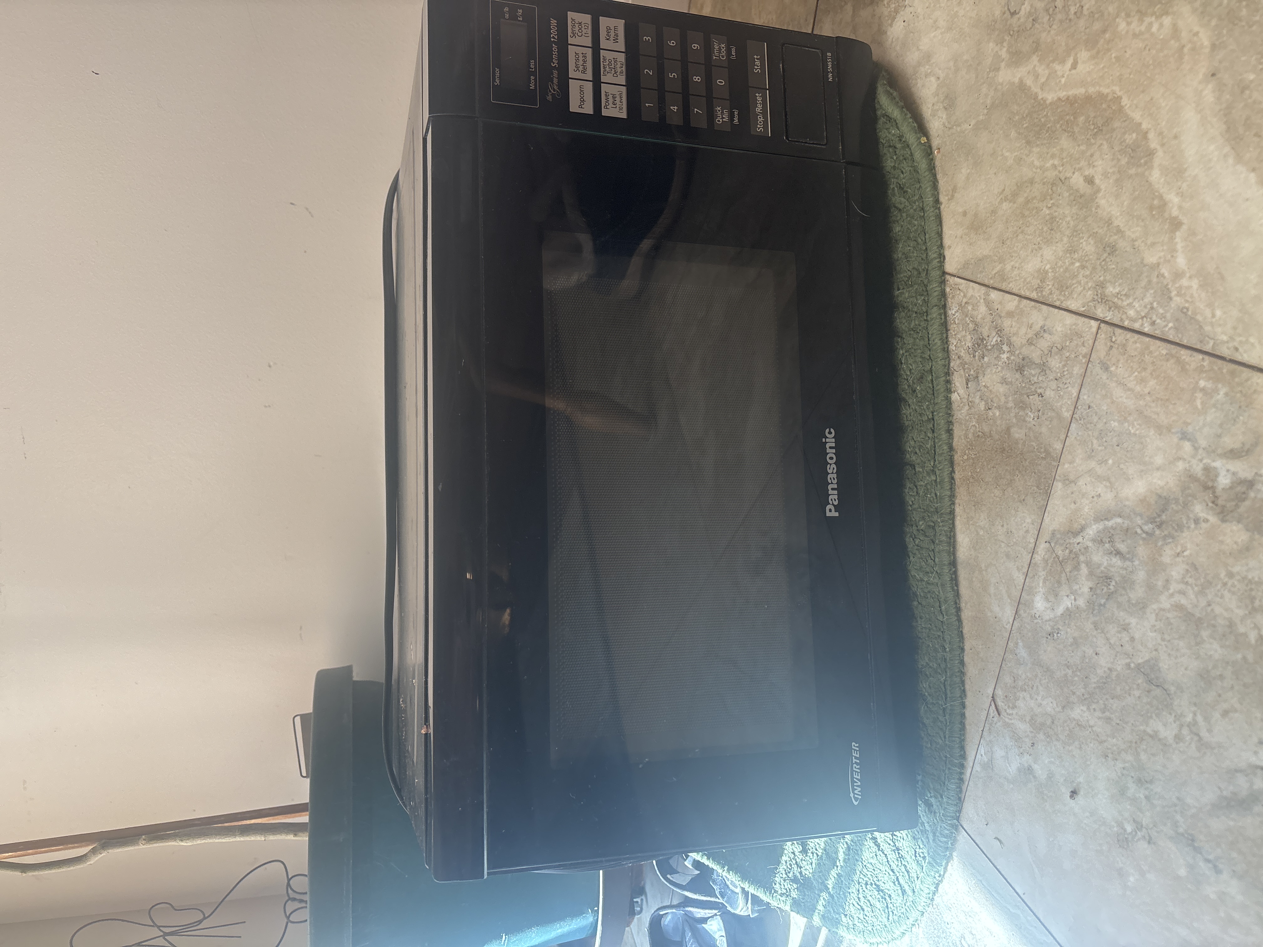 Panasonic. Counter top microwave. Black, 1200 watt. Sensor reheat button, timer clock, quick minutes and more. Still runs awesome. The light went out . Don’t feel like changing. 14” deep 20” long with a 13 “ turntable. Nice micro, we have 2. Asking $45.00 760-264-6582