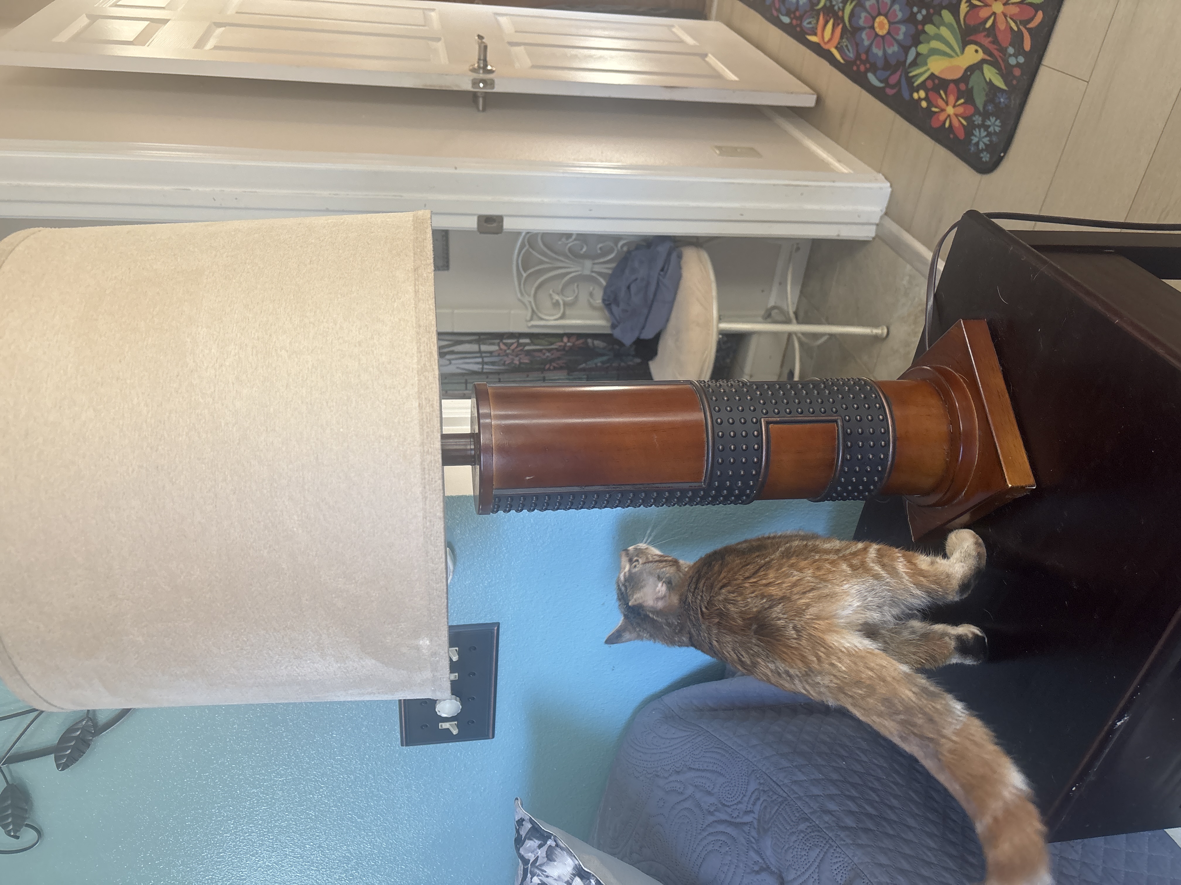 LAMPS (2) wooden looking base with bronze metal lined decoration on both stems, the lamp shades are cream color a lite velvitine material. With stand and shade they stand 28” high. Selling the pair for $46.00. 760 264-6582.