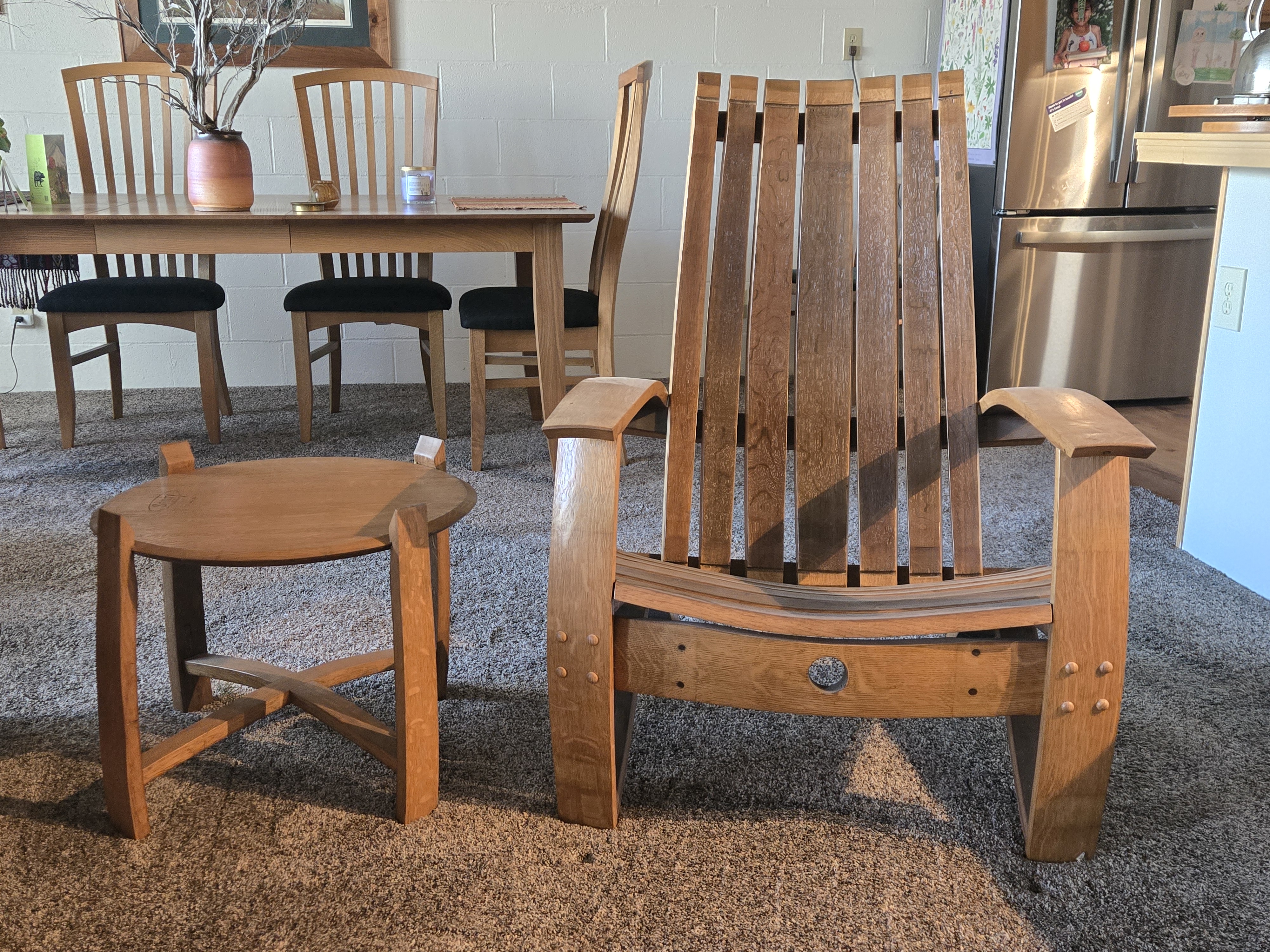 $25 for an adirondack style chair made from wine barrel staves and a side table. I live in Independence, CA. I will not deliver. My phone number is 925-596-0148.